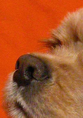 縮小版ではノイズは目立ちませんが、100% 以上に拡大するとノイズが明白になります。赤の背景上にある輝度ノイズや、ペットの毛の上にあるカラー ノイズ (赤やバイオレット色で点在したノイズ) が確認できます。